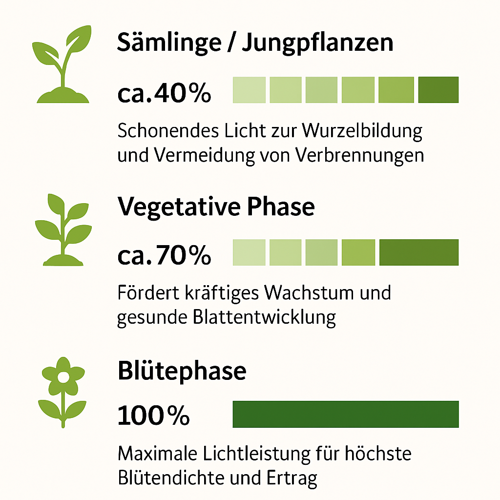 | Pflanzenphase | Empfohlene Dimmstufe | Hinweis |