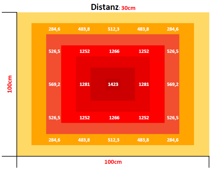 - PPF-Wert (photosynthetisch aktive Strahlung): 722 μmol/s